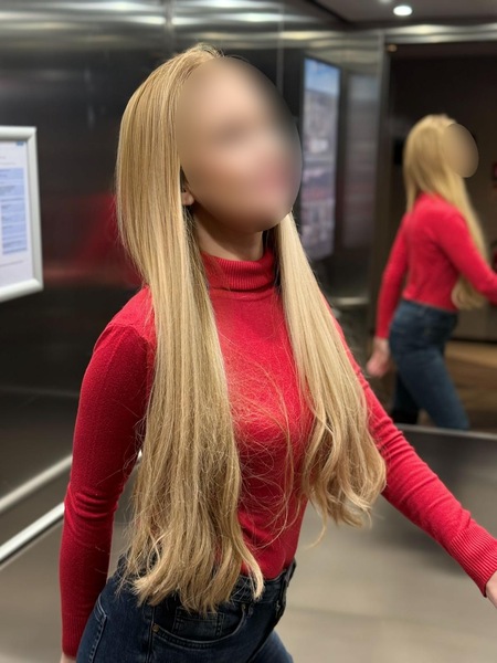 Haare:blond, rückenlang, glatt