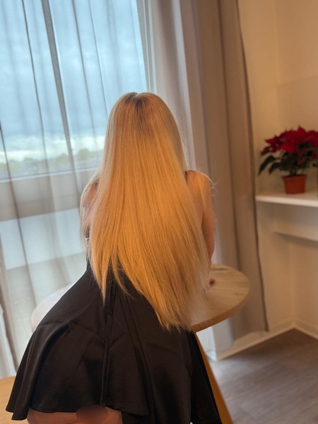 Haare:blond, rückenlang, glatt