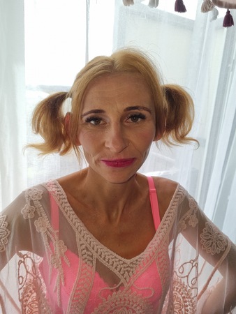 Haare:blond, schulterlang, wellig